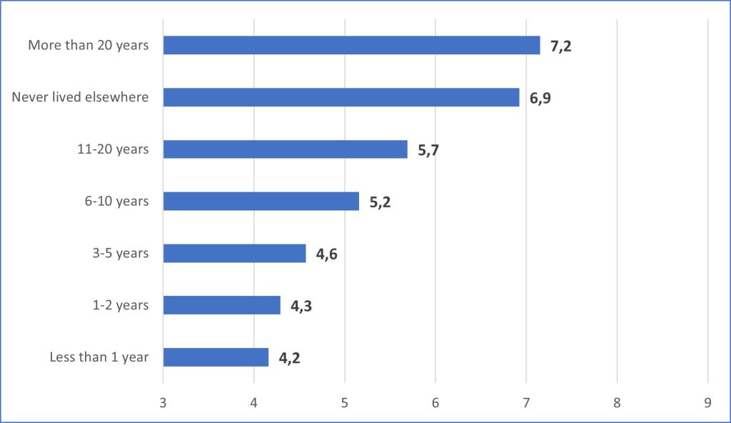 Figure 10 below, clearly indicates that those who have always lived in Iceland or have lived there for more than 20 years are more integrated in Icelandic culture through participation than those who have lived in the country for a shorter period. Scores of 6.9 and 7.2 out of 9 must be considered as quite active participation. The figure also shows that participation, as measured by the index, is closely connected to length of residency in the country. The index scores have a linear increase from the lowest score of 4.2 up to 7.2.