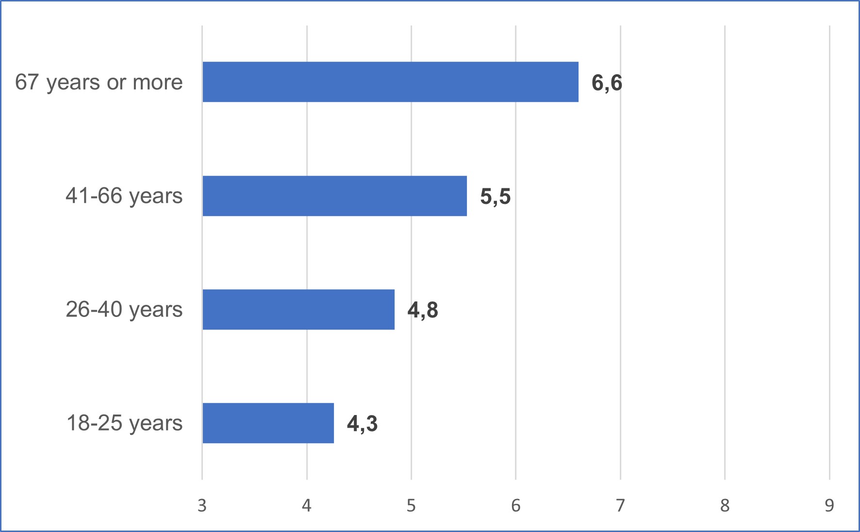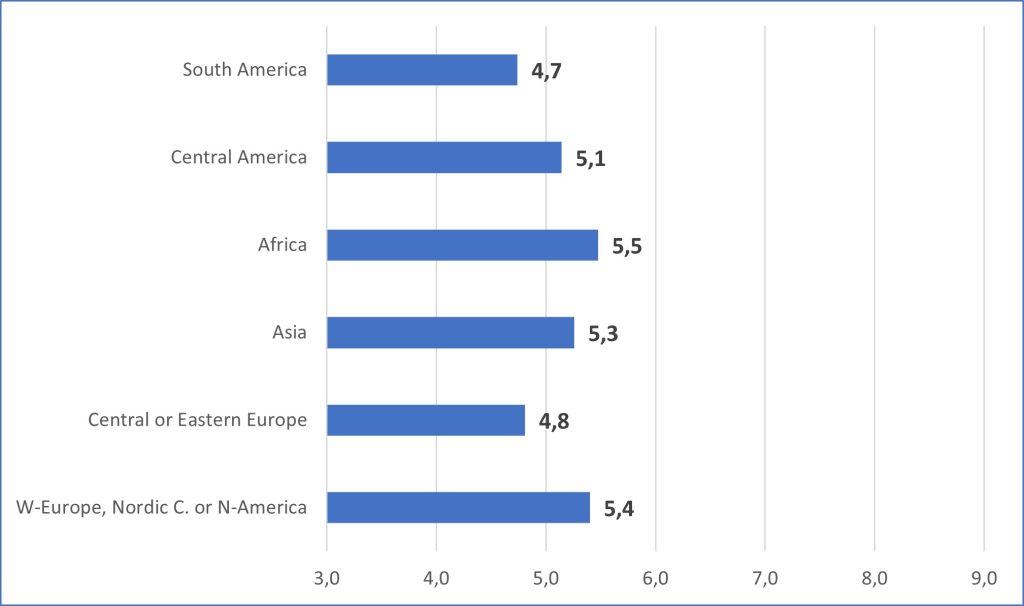 The last background variable we look at is the geographical region of immigrants’ origin. The differences seem to be small. The average scores vary between 4.7 and 5.5 on the 3-9 scale which cannot be considered much – the difference between the lowest and the highest score is 13 percent of the whole scale. However, we can still see that immigrants from South America and Central and Eastern Europe have lower scores, while immigrants from Africa and Western Europe, the Nordic and North America have the higher scores. That is indeed in line with the afore mentioned numbers on a higher voter turnout in 2018 and 2022 elections of Nordic immigrants than other immigrants.