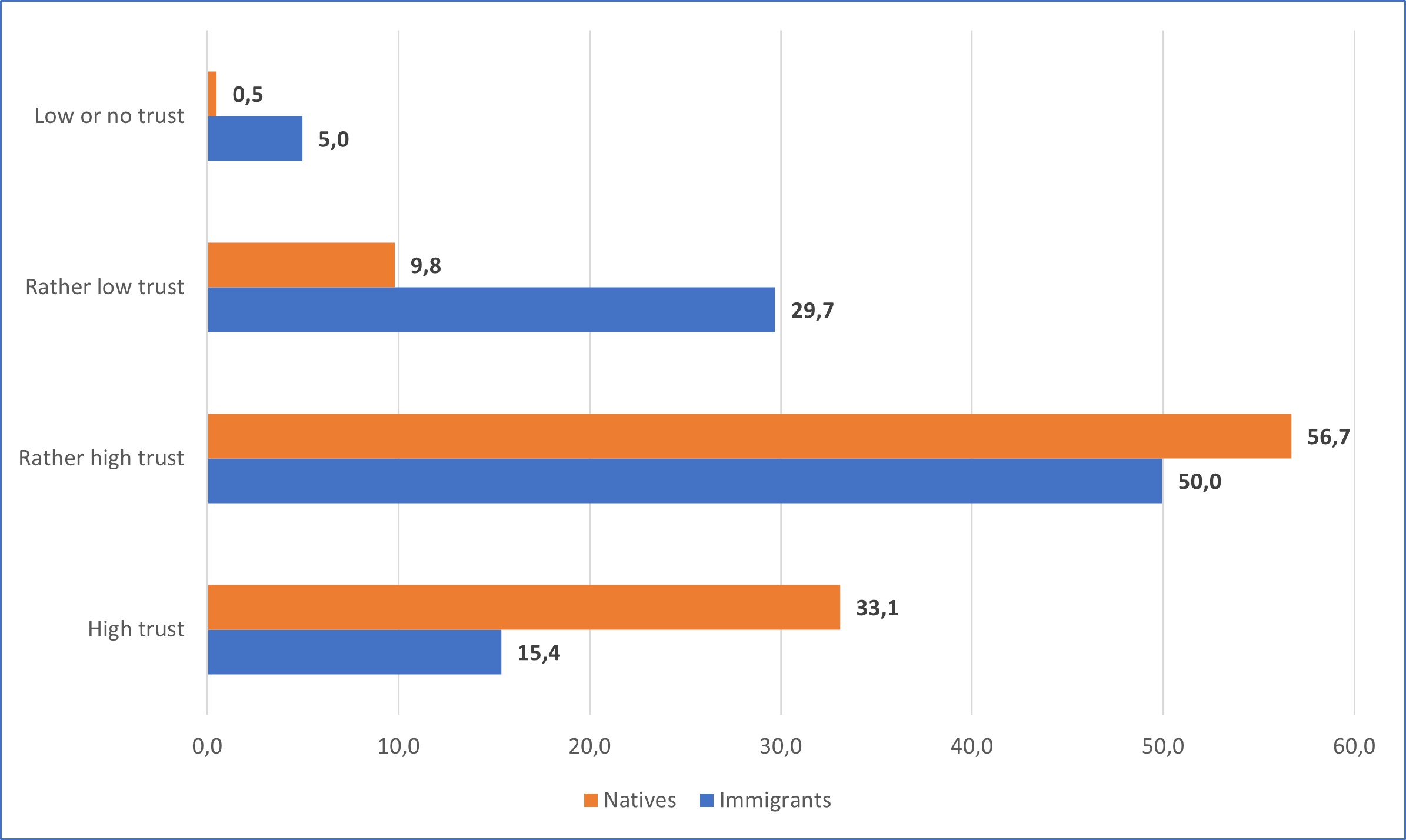 Figure 16. Immigrants’ and natives’ trust in institutions – categories (%).