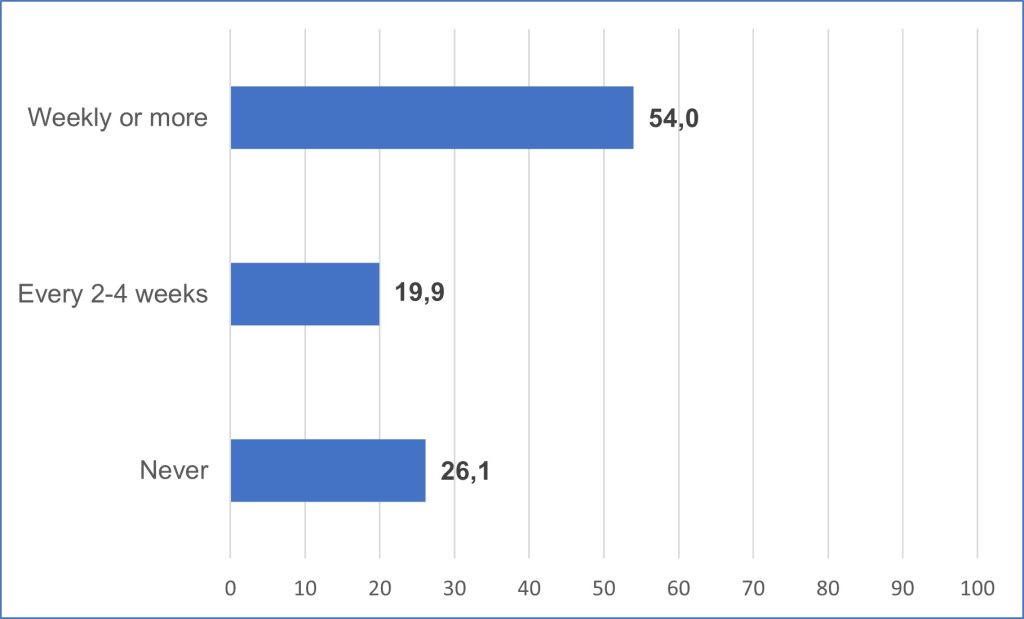 “Use of Icelandic media” comprises answers to a question about the frequency of using domestic media. The classification was: “Never” (1), “Every 2-4 weeks” (2), and “Weekly or more” (3). As figure 2 shows, more than 50 percent of immigrants use Icelandic media weekly or more, while about ¼ never do.