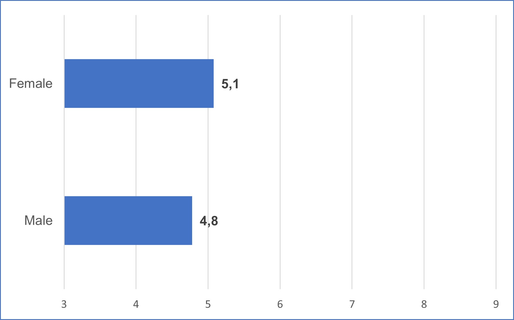 The average scores for male and female immigrants are very similar as Figure 8 shows. The numbers for females are slightly higher, but a difference between male and female of 0,3 on the 3 – 9 scale is very little.